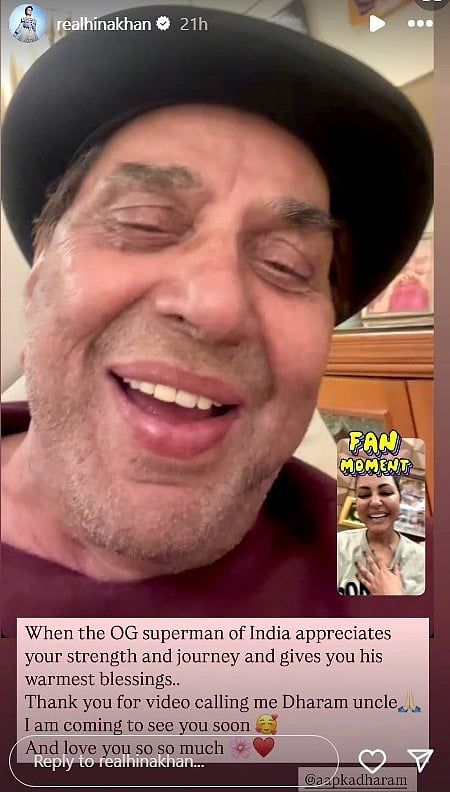 TV oyuncusu Hina Khan geçtiğimiz günlerde usta aktör Dharmendra’nın nimetlerini paylaşması için onu videoya çağırdığı özel bir “hayran anı” yaşadı. Üçüncü aşama meme kanseri ile mücadele eden Hina, efsanevi aktörün nazik jestinden derinden etkilendi.