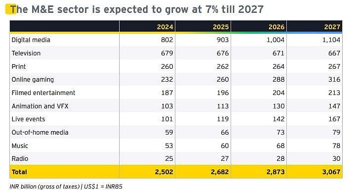 Ernst & Young tarafından hazırlanan bir raporda, Hindistan medya ve eğlence (Birleşme ve Satın Alma) endüstrisinin 2027 yılına kadar yıllık yüzde 7 oranında büyüyerek 3,07 trilyon Rs’ye (36,1 milyar $ veya 132,6 milyar Dh’ye) ulaşacağı belirtildi.