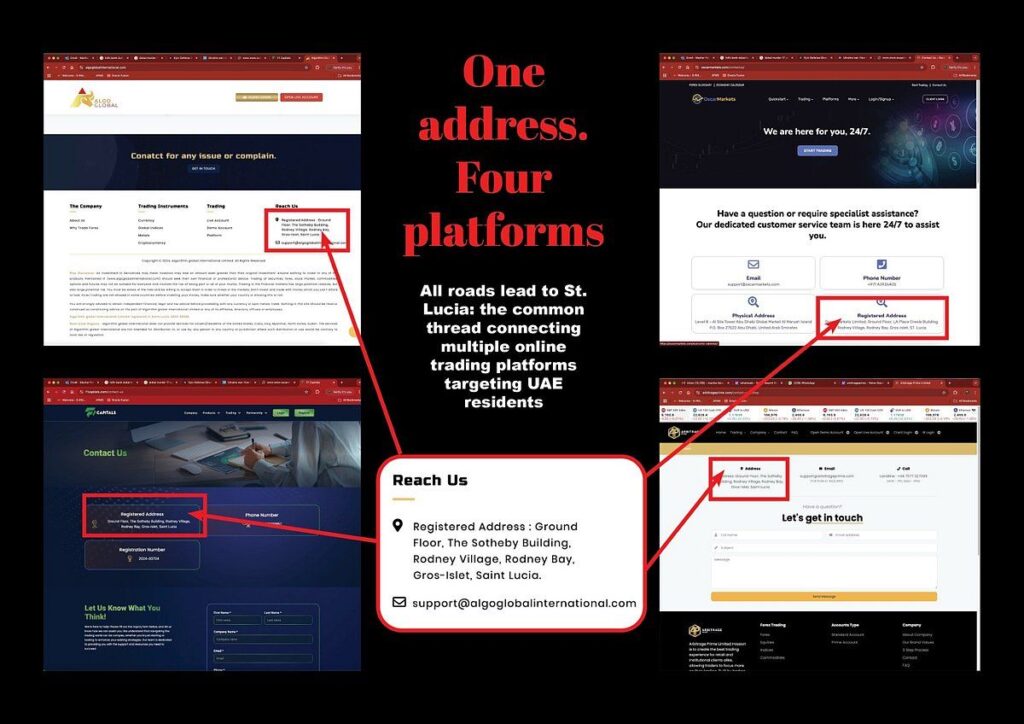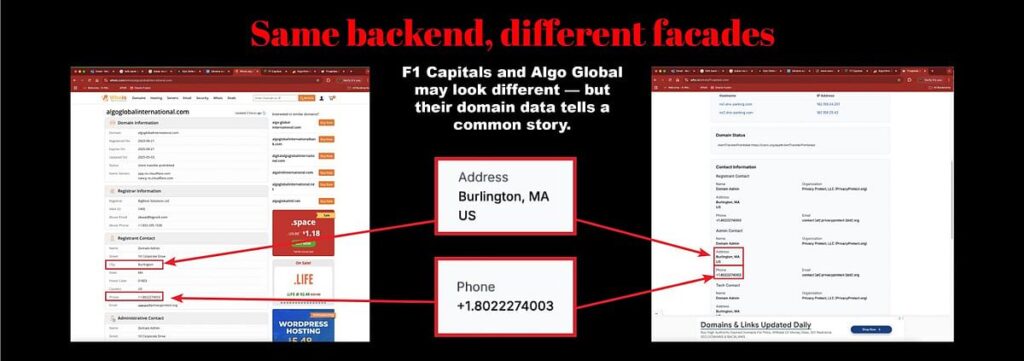 Noida ve Jaipur merkezleri tarafından agresif bir şekilde desteklenen Algo Global International, şu anda BAE merkezli çağrı merkezleri tarafından pazarlanan F1Capitals Markets, Oscar Markets ve Arbitraj Prime ile aynı Saint Lucia adresini listeliyor. Etki alanı kayıtlarında daha fazla örtüşme ortaya çıkar. Her ikisi de f1capitals.com ve algoglobalinternational.com aynı proxy kimliği altında kayıtlıdır: bir ABD adresine ve arkasında maskelenmiş bir telefon numarasına bağlı ”Alan Adı Yöneticisi” @privacyprotect.org .