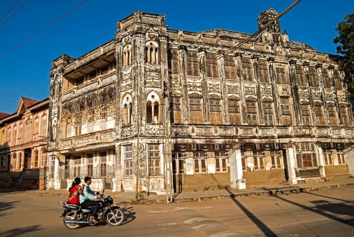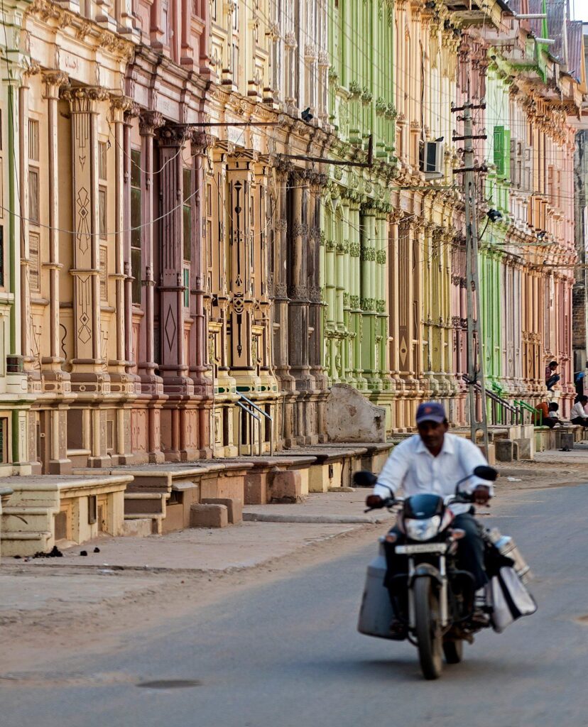 Tipik bir Hint kasabasının kaotik yaşamı, Bohravadların ve Avrupa’dan koparılmış olabilecek oyulmuş havelilerinin ötesinde dönüyor. Hint Gotik dokunuşlarıyla neoklasik Avrupa, Barok, Art Nouveau tarzlarında inşa edilen anıtsal yığınlar, neredeyse somurtkan bir sessizliğin içinde yer alıyor. Sıra evler, müreffeh Dawoodi Bohra tüccarlarının (zengin bir Şii Müslüman mezhebi) geliştiği ve maddi başarılarını dünyaya duyurmak için onları inşa ettikleri canlı bir geçmişin anılarına dalmış görünüyor. Bu, 1820’ler ile 1930’lar arasındaydı. Cephelerinde özenli sıva işleri, pilastrlar, süslü kafesli balkonlar ve üçgen çatılar bulunan muhteşem konaklar, sahibinin baş harflerini aile arması benzeri tasarımlarda gururla sergiliyor.