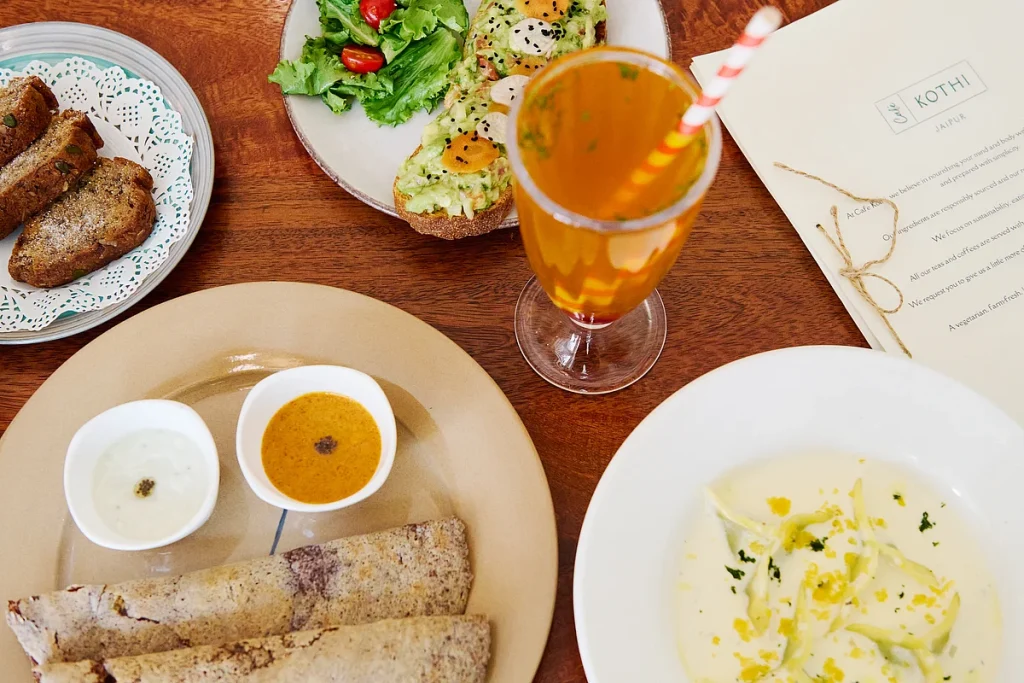 Alışverişi bitirir bitirmez mücevher tasarımcısı Munnu Kasliwal için yaratılmış butik lüks bir otel olan 28 Kothi’ye gittim. İşletmeye bakan ve sakin alanı keşfeden Raadhia Chaudhry tarafından karşılandım — Honawar ile Munnu Kasliwal’ın en büyük oğlu Siddharth Kasliwal arasında zarafeti bir huzur duygusuyla harmanlayan bir işbirliği. 28 Kothi’nin içinde, menünün küçük olmasına rağmen özenle hazırlandığı ve güzel bir şekilde yürütüldüğü, yerel, bölgesel ve küresel lezzetleri kaynaştırdığı samimi bir mekan olan Cafe Kothi’dir. Rava dosa’yı lauki (kabak) ve patates dolgulu denedim, hindistancevizi ve kırmızı hint turşusunun yanında servis ettim ve chia tohumlarıyla aşılanmış hindistancevizi suyuyla eşleştirdim. Burası gerçekten evden uzakta bir ev gibi hissettiriyordu.