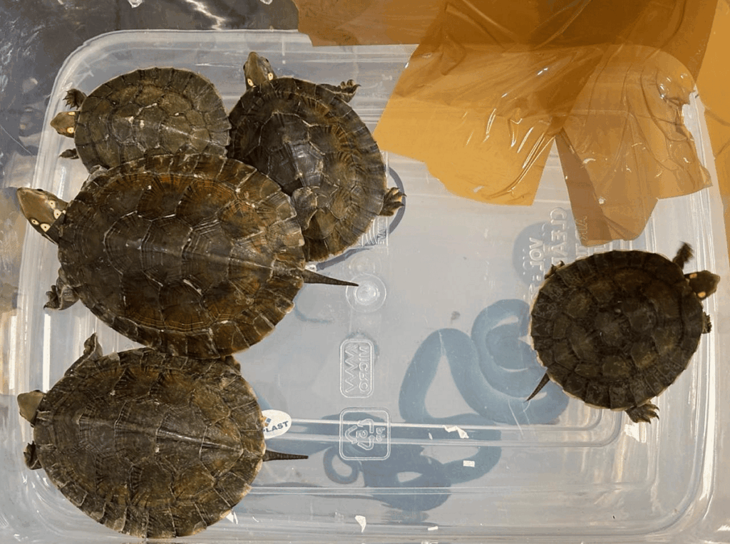 Kasım ayında yetkililer, 12 kaplumbağadan oluşan kıvranan bir canlı kargo taşıyan bir yolcu buldular.