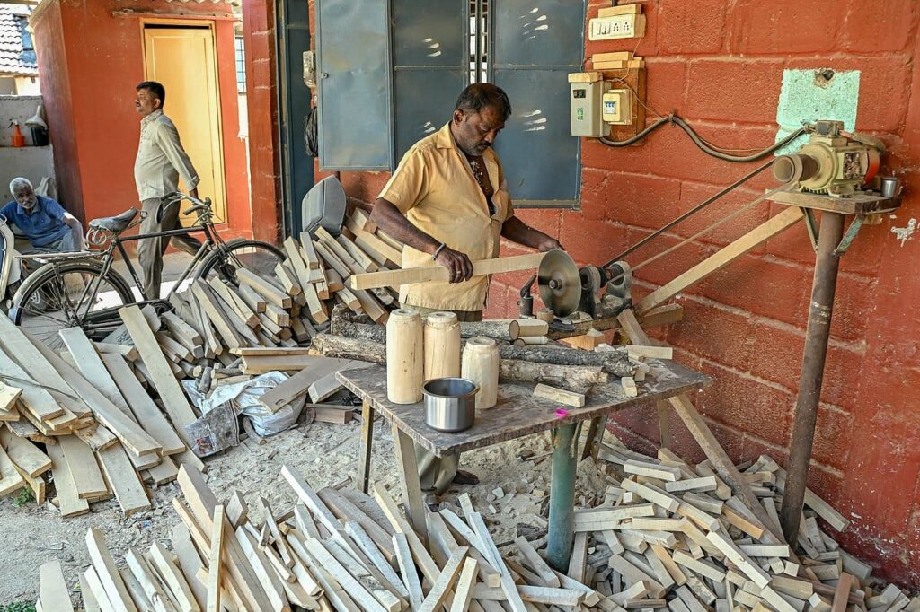 Güneydeki Karnataka eyaletindeki kasabada yaklaşık 2.500 zanaatkarın çalıştığı atölyelerde sallanan atlar, bebek yürüteçleri ve tahtadan kesilmiş dans eden bebekler yaygın bir manzaradır.