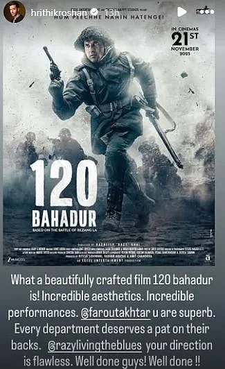 Bollywood yıldızı Hrithik Roshan, Farhan Akhtar’ın son filmi 120 Bahadur için övgüyle karşılandı ve onu “inanılmaz estetikle” “güzel hazırlanmış” olarak nitelendirdi.