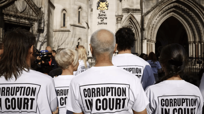 Carr kararı okurken, yaklaşık 20 aktivist ayağa kalktı ve arkasında “Mahkemede Yolsuzluk” yazan tişörtler giydiklerini ortaya çıkarmak için arkasını döndü.