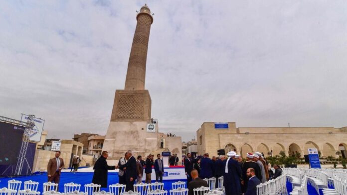 Kuzey Irak’taki Musul’un eğimli minaresi, Daeş yönetimi altında moloza dönüştürüldükten yıllar sonra orijinal tuğlası kullanılarak restore edildi.
