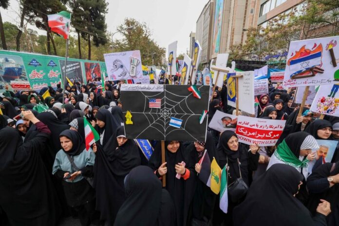 İranlı göstericiler, on yıllardır Washington ile Tahran arasındaki ilişkileri şekillendiren 1979 rehine krizinin yıldönümünü kutlamak için Pazar günü Tahran’daki eski ABD büyükelçiliği önünde toplandılar.