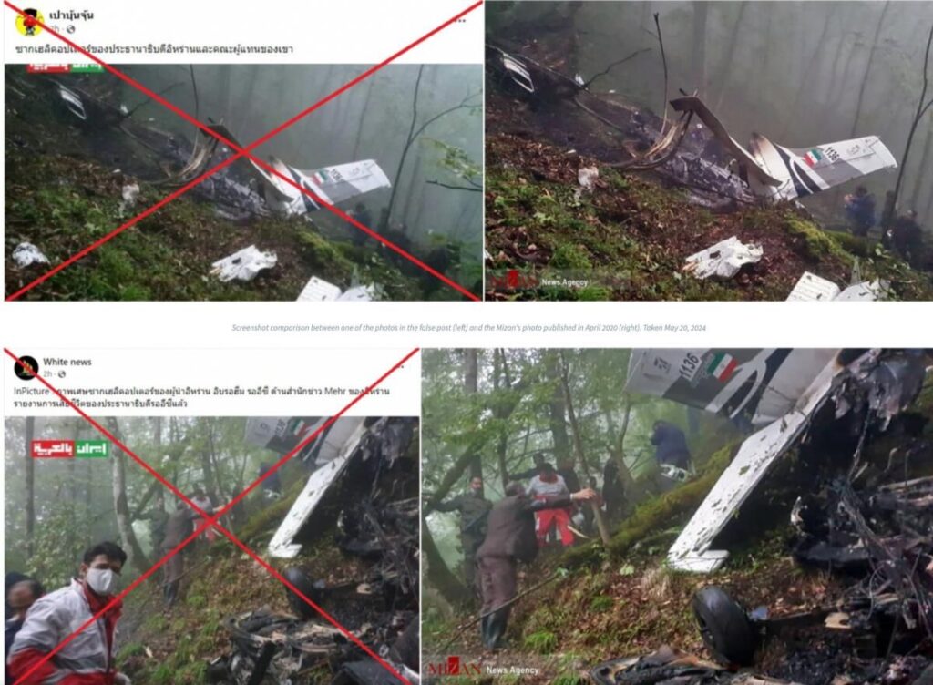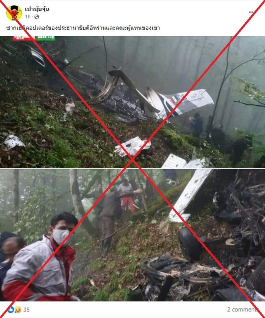 İran Cumhurbaşkanı Ebrahim Raisi, helikopterinin yoğun sis altında ücra bir dağ yamacına çarpması sonucu 20 Mayıs’ta ölü ilan edildi. Bununla birlikte, dünya çapında sosyal medyada dolaşan ve etkilenen helikopterin enkazını gösterdiği iddia edilen fotoğraflar aslında farklı bir kaza gösteriyor. Görüntüler 2020’de İran haberlerinde Mazandaran eyaletinde düşen bir polis eğitim uçağı hakkında yayınlandı.Fotoğrafları paylaşan Taylandlı bir Facebook gönderisini “İran cumhurbaşkanı ve heyetinin helikopterinin enkazı” okudu. Resimler, kanatta “1136” yazılı uçak enkazının yanındaki bir ormandaki kurtarma görevlilerini gösteriyor.