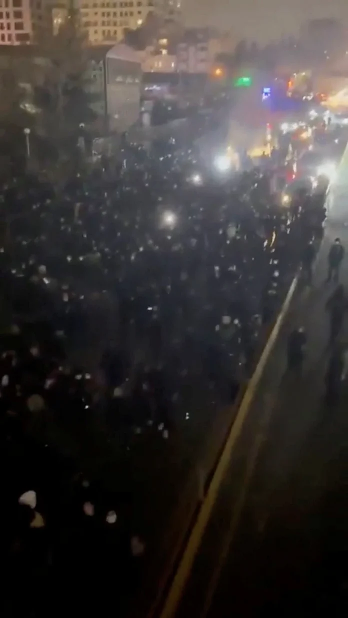 İran’ın kuzeyindeki Pounak bölgesinde, bir otoyolun ortasında ateşin etrafında dans eden insanlar gösterilirken, Şii İslam’ın en kutsal tapınaklarından birine ev sahipliği yapan Meşhed’in Vakilabad bölgesinde insanlar “Hamaney’e ölüm” diyerek bir caddeden aşağı yürüdüler.