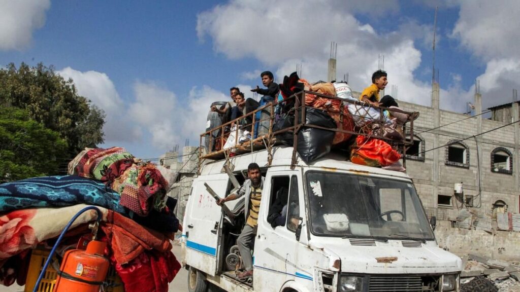 Yerinden edilmiş Filistinliler, İsrail güçlerinin Refah’ta kara ve hava operasyonu başlatmasının ardından Refah’tan kaçarken bir araçla seyahat ediyorlar. – ReutersOrdu, bu bölgelerin çoğunun kontrolünü aylar önce ele geçirdiğini iddia etmişti.İsrail Savunma Kuvvetleri, güney Kerem Şalom bölgesinde hava sirenlerinin çaldığını ve Refah çevresinden fırlatılan iki roketi başarıyla ele geçirdiğini söyledi. Herhangi bir yaralanma olmadığını ve herhangi bir hasar bildirilmediğini söyledi.Pazar gününün ilerleyen saatlerinde İsrail’in Aşkelon kentinde, Gazze’den gelen roket ateşi sonucu sirenler çaldı ve bu, militanların yedi aydan fazla süren savaştan sonra hala roket saldırıları başlatabileceklerinin sinyalini verdi.