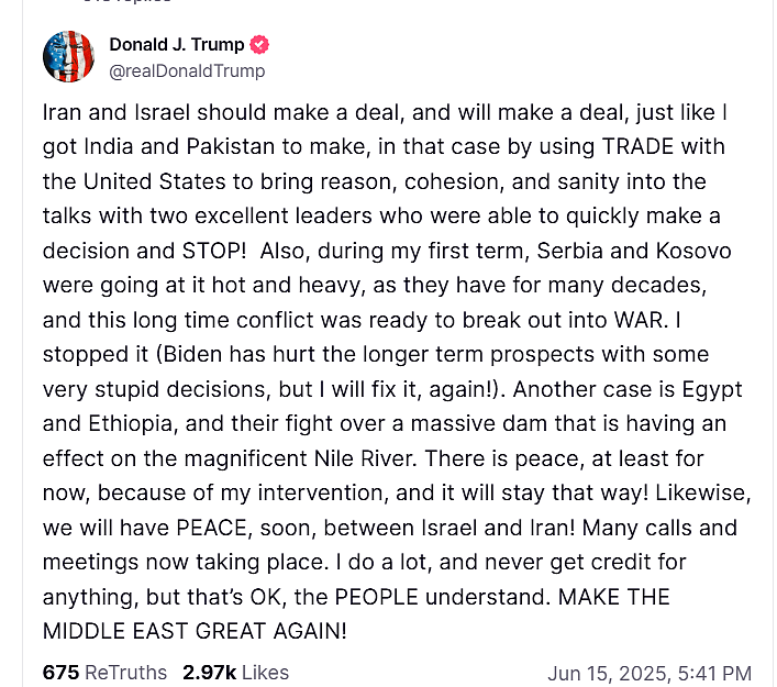 Kendisini barışçı olarak gösteren ve İsrail-İran çatışmasını önleyemediği için siyasi tabanından eleştiriler alan Trump, Hindistan ile Pakistan arasındakiler de dahil olmak üzere çözmekten sorumlu olduğu diğer anlaşmazlıklara atıfta bulundu ve bunu yaptığı için daha fazla övgü almamaktan yakındı.