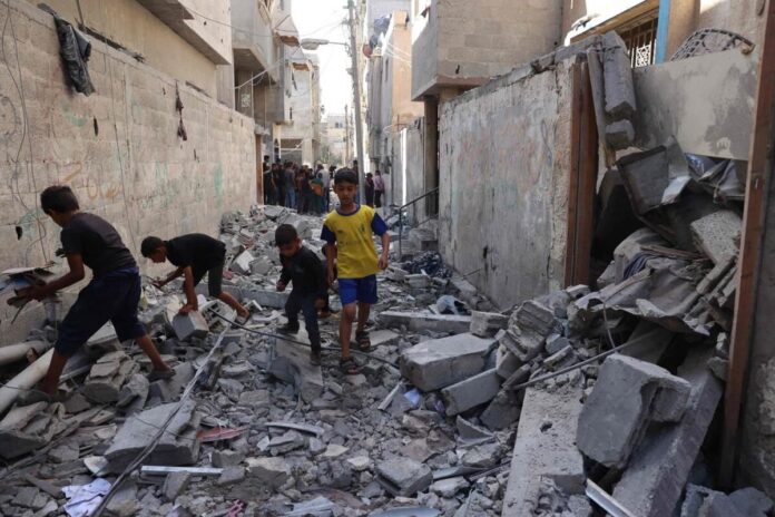 İsrail saldırısının yerinden edilmiş Filistinliler için bir kampı yaktıktan sonra Pazartesi günü Gazze’nin güneyindeki Refah şehrinde insanlar kömürleşmiş barınak kalıntılarını temizledi ve çocuklar yiyecek kurtardı.
