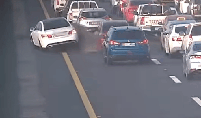 Abu Dabi Polisi, Körfez Trafik Haftası kapsamında üç kazanın görülebildiği 57 saniyelik bir klibi paylaştı. İlk olayda, hızlanan gri bir sedan üçüncü şeritte beyaz bir arabaya çarpıyor. Sürücü son anda kaçamak bir eylemde bulunmaya çalışır, ancak araç dikkat çekmeden ve soldaki güvenlik bariyerine çarpmadan önce sürücü öndeki arabaya çarptığı için çok geç kalır. Araba korkuluklara çarptıktan sonra takla atar ve durmadan önce baş aşağı yuvarlanır.