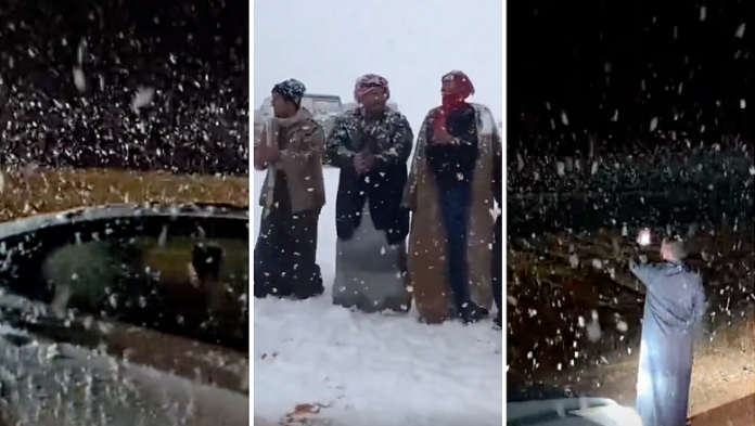 Büyük kahverengi kum tepelerindeki kar yağışı videoları, Suudi sakinlerinin kirpi ceketlerinde görüldüğü, dillerinde Tanrı’ya övgüler ve gözlerinde parıldayan bir huşu görüntüsü olduğu için internette dolaşıyor.