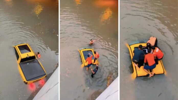 Video, Khan’ın bir suv’un çatısını çekiçle ölçeklendirdiğini ve batık bir kamyonun içinde sıkışıp kalan beş kişiye ulaşmak için cam çatısını kırdığını gösteriyor.