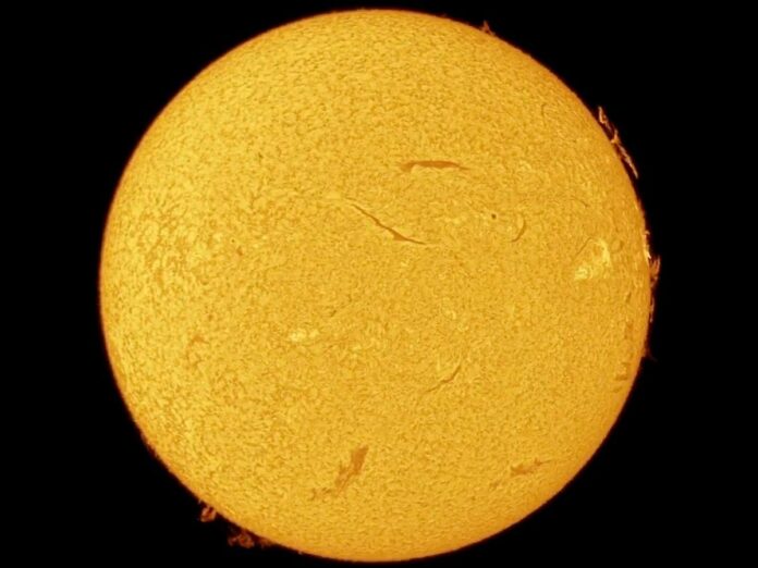 Bu güneş teleskopu aracılığıyla görülebilen Güneş tabakası, fotosferin üzerinde yer alan kromosferdir — normalde çıplak gözle veya normal teleskoplarla görülebilen katman.