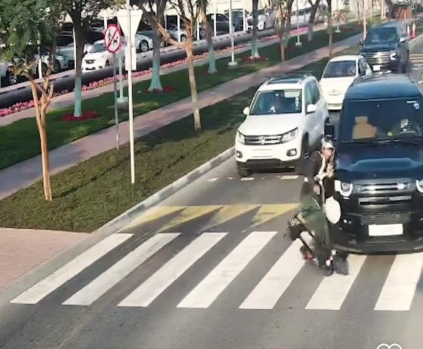 Güvenlik kameraları tarafından yakalanan bir Dubai yolunun gerçek görüntüleri olan videoda, bir araba ona çarpmak üzereyken yolun karşısına geçmeye çalışan bir e-scooter sürücüsü gösteriliyor. Burada ikisi de hatalıydı.