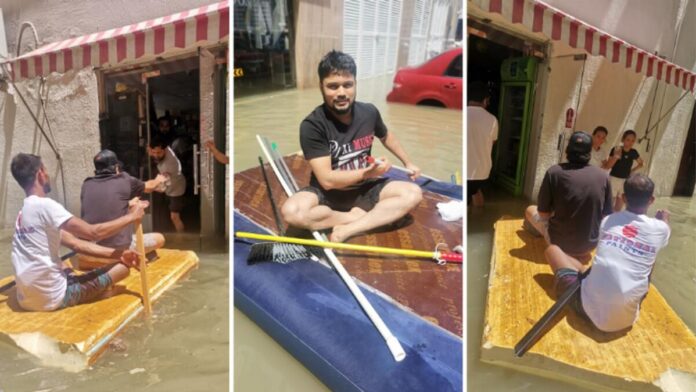 Çarşamba günü, birçok insanın Sharjah’ın su basmış bölgelerinde yelken açmak için derme çatma tekneleri ve kanoları kürek çekmek için paspas, zemin temizleme fırçası ve silecek kullandığı görüldü. Derme çatma teknelerin bazıları, hareket etmelerini kolaylaştırmak için ahşap ve şiltelerden yapılmıştır.