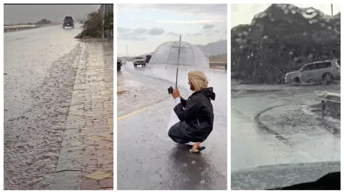 Başka bir videoda, kameranın arkasındaki adam, yolun kenarında çömelmiş olan Omar Al Nuaimi, koşan arabaları kaydetmek için elinde şemsiye de görülebilir.