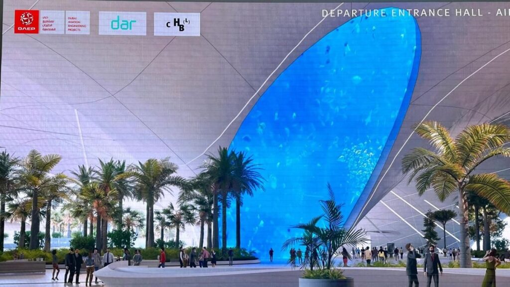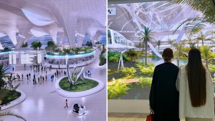 Şehir içindeki bir şehir – Al Maktoum Uluslararası Havaalanı (DWC) tamamlandığında bu şekilde olacak. Kendi ulaşım sistemine, mini ormanlara, yeşil bölgelere, eğlence merkezine ve yiyecek, içecek ve perakende gibi diğer tekliflere sahip olacak.İlk fotoğraflar ilk olarak geçen ayın sonlarında, yeni yolcu terminalinin tasarımının Başkan Yardımcısı, BAE Başbakanı ve Dubai Hükümdarı Şeyh Muhammed bin Rashid Al Maktoum tarafından bir tweet ile duyurulmasıyla ortaya çıktı.Salı günü, dwc’deki yeni yolcu terminalinin tasarımından sorumlu olan Dubai Havacılık Mühendisliği Projeleri (DAEP), devam eden 23. Havalimanındaki ziyaretçilere dünyanın en büyük havalimanının nasıl görüneceğine dair daha ayrıntılı bir önizleme sundu.DWC’NİN çarpıcı özelliklerinden biri, terminaller arasında yolcu taşıyan kapalı bir tropikal ormanı kesecek yükseltilmiş bir raylı veya otomatik insan taşıyıcı (APM) sistemidir. Çeşitli manzaraları ve deniz yaşam alanlarını yansıtan dev LED ekranlar da var.