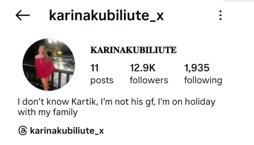 Artan spekülasyonların ortasında Karina Kubiliute, konumunu netleştirmek için İnstagram biyografisini güncelledi. Artık silinmiş biyografisi şöyle: “Kartik’i tanımıyorum, onun kız arkadaşı değilim, ailemle tatildeyim.”