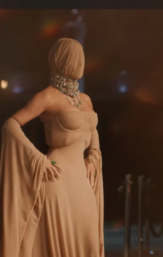 İmza stili ve kırmızı halı görünümüyle tanınan Kim, yüzü tamamen kapalı bej renkli bir kıyafet giyerek dramatik görünümüyle herkesi bir kez daha hayrete düşürdü. Görünümüne cazibe katan şey büyük bir kolye ve zümrüt yüzüklerdi.