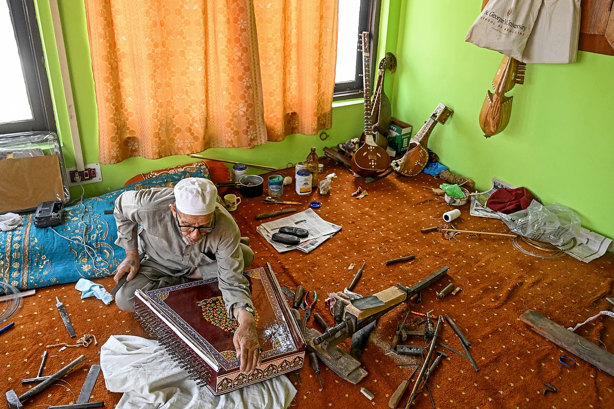 Tecrübeli ahşabın kokusuyla dolu mütevazı bir atölyede, 78 yaşındaki Ghulam Mohammad Zaz, ailesinin sekiz nesildir koruduğu bir zanaata devam ediyor – Keşmir santurunun yapımı.