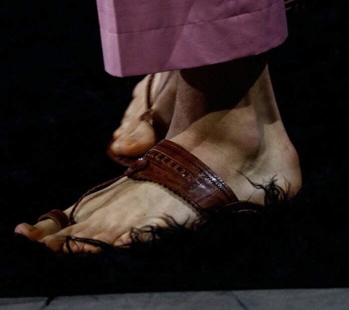 Prada’nın geçen hafta sonu Milano’daki defilesinden görüntüler, 12. yüzyıldan kalma tasarımlarla el yapımı Kolhapuri terliklerine benzeyen örgülü tasarıma sahip deri sandaletler giyen modelleri gösterdi.