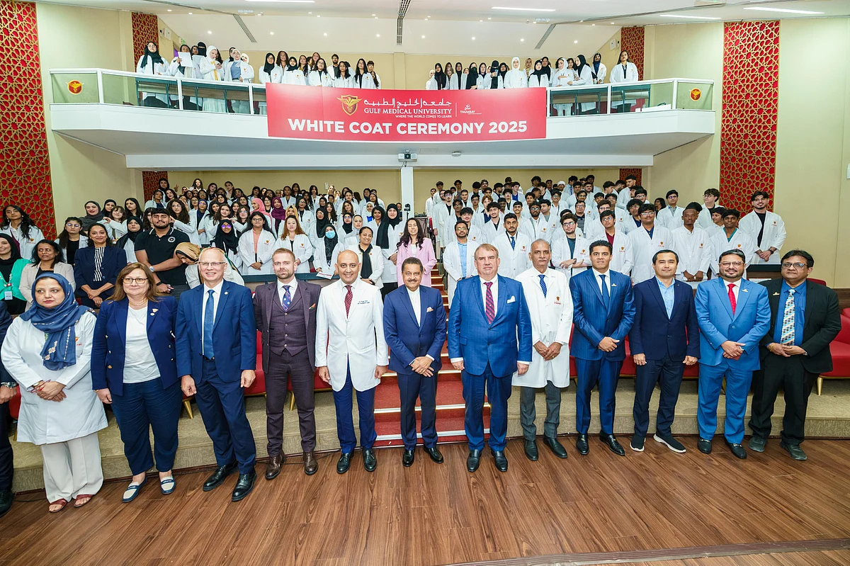 Thumbay Grubuna ait Körfez Tıp Üniversitesi (GMU), bu yıl 1.189 öğrencinin üniversiteye katılmasıyla önemli bir akademik dönüm noktasını kutladı ve tüm lisans öğrencileri beyaz önlüklerini giyip mesleki yemini ettiler — resmi olarak çalışmaya ve uygulamaya girişlerini kutladılar. sağlık hizmetleri.