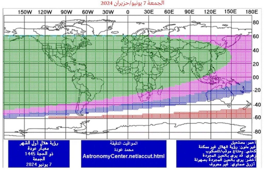 Yukarıda belirtilen dokuz ülkenin de 17 Haziran Pazartesi günü Kurban Bayramı’nın ilk gününü kutlaması bekleniyor.Bugün hilali görmek islam dünyasının tüm ülkelerinden mümkün, Arap bölgelerinden gelen hilal 7 Haziran Cuma günü gün batımından sonra nispeten büyük görünüyor.Astronomi Merkezi tarafından sağlanan bir haritada Zilhicce ayının hilalinin ne kadar uzakta görülebildiğini göstermektedir.