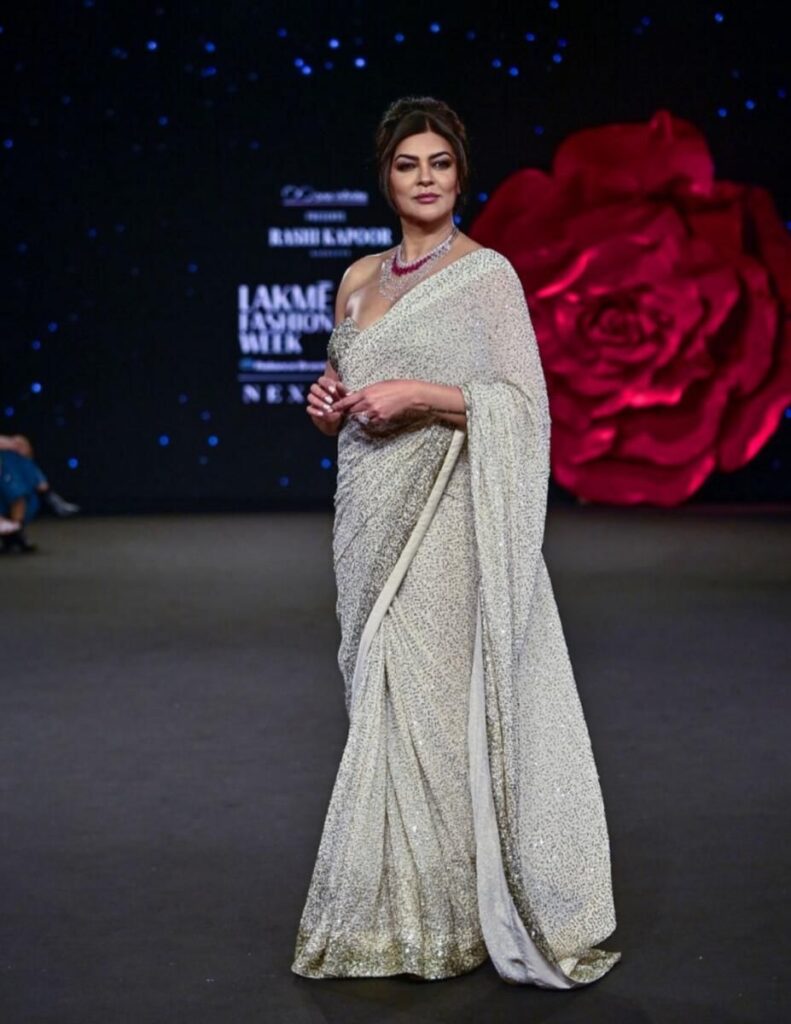 Sushmita Sen, Pazar günü tasarımcı Rashi Kapoor’un göstericisi olarak pisti süsleyen spot ışığını çaldı.Eski Miss Universe, kendine olan güvenini ve zarafetini, pullarla süslenmiş ve modern Hint modasının özünü somutlaştıran çarpıcı askısız bir bluzla eşleştirilen nefes kesici beyaz fildişi bir sari ile sergiledi