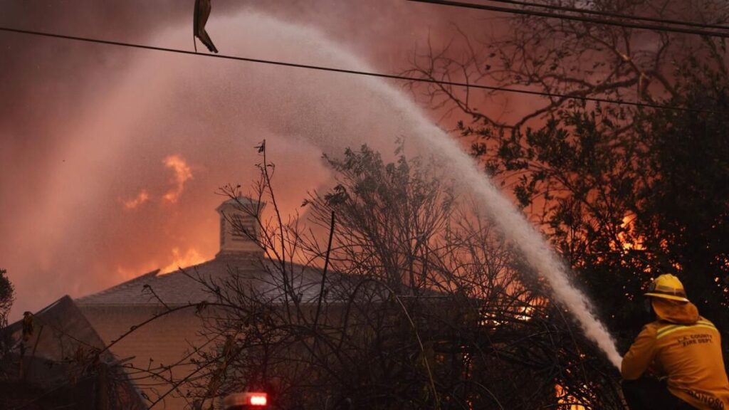 Çarşamba günü Kaliforniya, Altadena’daki Eaton Yangını sırasında ev yanarken bir itfaiyeci su püskürtüyor. Afp’nin
