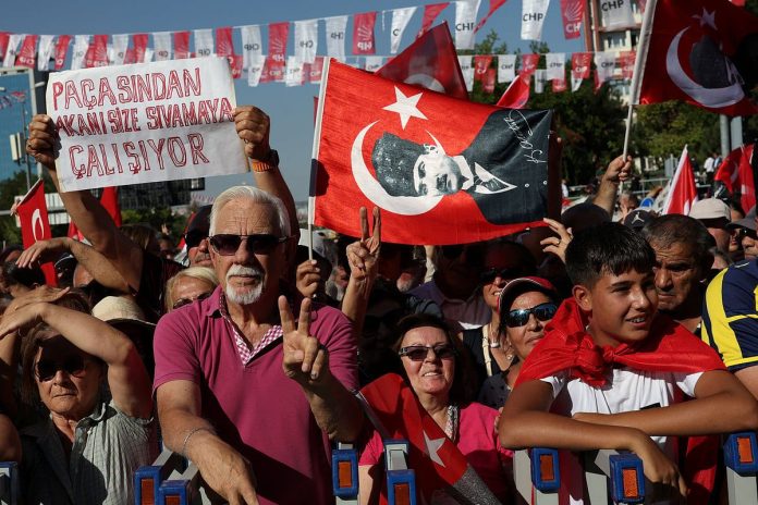 Örgütleyiciler ve AFP muhabirleri, en az 50.000 kişinin, partinin liderliğini devirebilecek kilit bir duruşma öncesinde Pazar günü Ankara’da Türkiye’nin ana muhalefetteki chp’sinin protestosuna katıldığını söyledi.