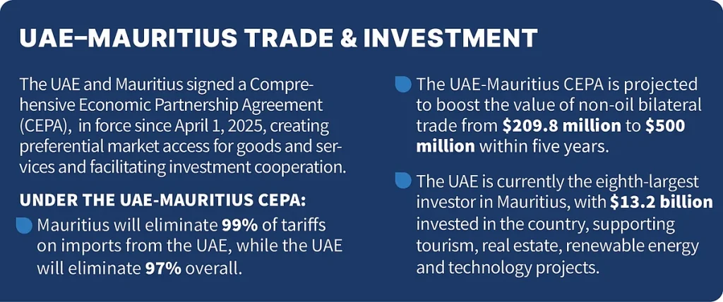 Bu evrim, BAE–Mauritius Kapsamlı Ekonomik Ortaklık Anlaşması’nın (CEPA) 1 Nisan 2025’te yürürlüğe girmesiyle yenilenmiş bir ivme kazanmıştır. BAE’nin bir Afrika ülkesiyle ilk cepa’sı olan anlaşma, Körfez-Afrika ilişkilerinde stratejik bir kilometre taşını işaret ediyor ve ticaret, yatırım, finans, turizm ve teknolojide ekonomik işbirliğini derinleştirme konusundaki ortak bir hırsı yansıtıyor.