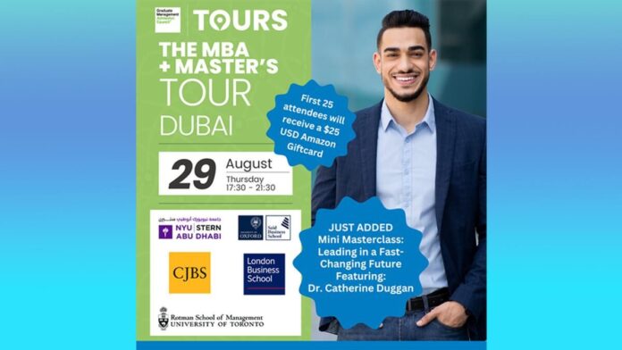 Kariyerinizi bir üst seviyeye taşımaya hazır mısınız? GMAC Tours, 29 Ağustos’ta Dubai’ye gelecek olan merakla beklenen MBA + Master’s Tour’u duyurmaktan heyecan duyuyor ve dünyanın dört bir yanından en iyi işletme okullarının en iyi eğitim programlarını sergileyeceği bu özel etkinliğe katılmaya davetlisiniz. Bu, profesyonellerin NYU Abu Dhabi, Cambridge, Oxford, London Business School ve Toronto Rotman Üniversitesi gibi seçkin kurumlardan kabul temsilcileriyle doğrudan tek bir yerde bağlantı kurmaları için altın bir fırsat!