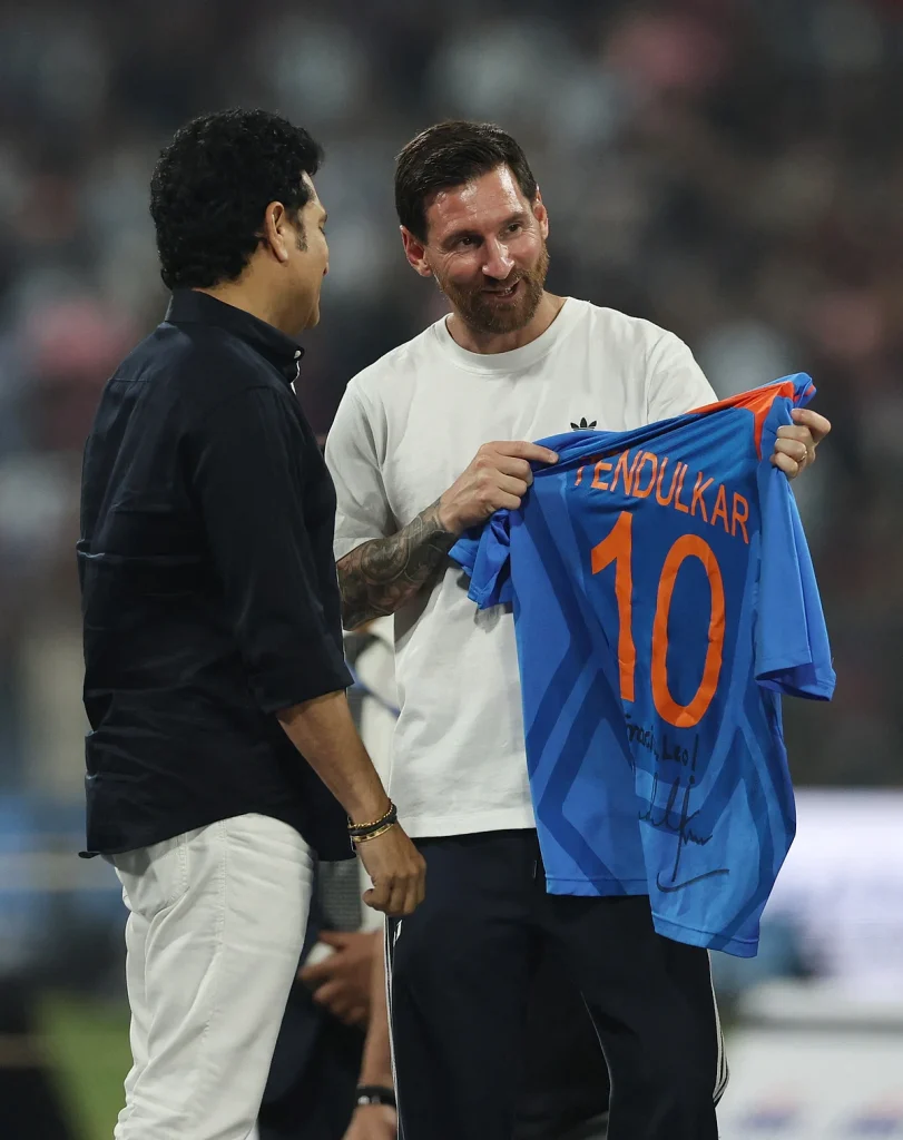 Kriket büyük Tendulkar, Messi’ye Hindistan’ın 2011 Dünya Kupası zaferinden ikonik 10 numaralı formasını aynı mekanda sundu.
