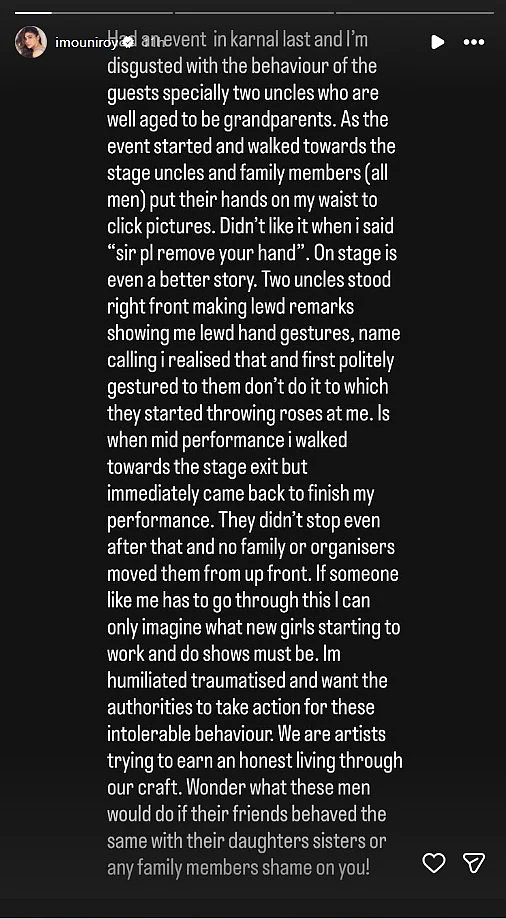 Başka bir İnstagram hikayesinde Mouni, “Biz zanaatımızla dürüst bir yaşam kazanmaya çalışan sanatçılarız. Arkadaşları kızlarına, kız kardeşlerine veya herhangi bir aile üyesine aynı şekilde davranırsa bu adamların ne yapacağını merak ediyorum. Kendinden utan!”
