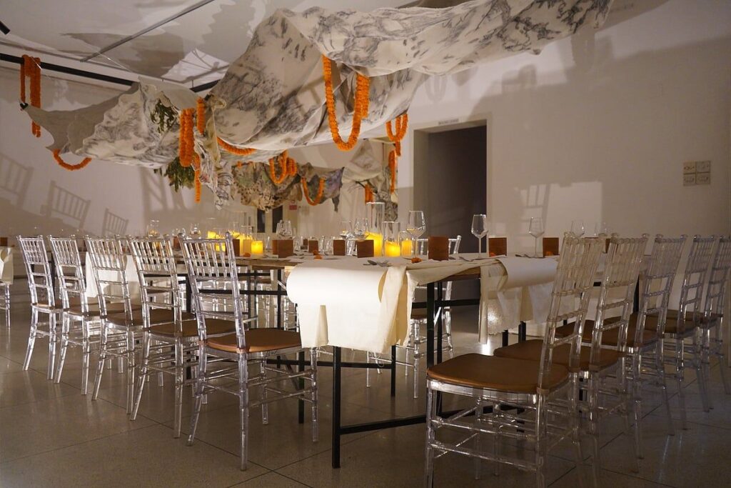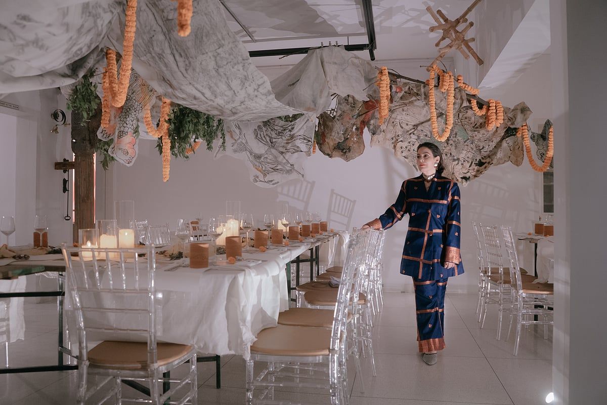 Tabbaa eleştirel araştırma, simya, çizim, tekstil, seramik ve heykel deneyleri arasında zahmetsizce gezinse de, muhtemelen en çok mutfak performanslarıyla tanınır. Yemeğin siyasetini ve sembolizmini harmanlayan büyüleyici bir tür olan mutfak sanatları, Tabbaa gibi sanatçıların kederi işlemek için kullandıkları esrarengiz ve aynı zamanda savaşın parçaladığı bir dünyada direniş ve protesto işareti olarak kullandıkları esrarengiz ve güçlü bir ifade biçimi olabilir. ve türbülans. Tabbaa’nın çalışması, mütevazı mutfağın hem samimi bir kişisel alan hem de siyasi ve sosyal bir savaş alanı olabileceğini, siyasi sınıfın hegemonyasına meydan okuduğu ve insanlık hakkında temel sorular sorduğu, ağırlığını tarihsel olarak ezilenlerin arkasına koyduğu bir iç ortam olabileceğini kanıtlıyor.Tabbaa, bölgede yaygın olarak sergilenen BAE sanat dünyasında tanıdık bir isim. Al Serkal Caddesi’nden Art Dubai’ye kadar, günlük yaşamın sert gerçeklerini yansıtmak için yemeğin büyüsünü çağırdı. “On yıldır gayri resmi olarak yiyecekleri bir öz bakım ve misafirperverlik eylemi olarak topluluk inşasının bir uzantısı olarak araştırıyorum. Ancak bu her zaman sanat dünyasının dışında kaldı. İrlanda’daki Cork’taki Ballymaloe Aşçılık Okulu’nda aşçılık ve çiftçilik diplomasını tamamlayan ve mutfak eylemlerini sahneleyen Tabbaa, “Bu sadece bir yaşam biçimiydi ve her zaman sahip olduğum araştırmaya olan ilgimdi” diyor. yıllar boyunca BAE’de atölye çalışmaları ve tatma seansları (‘Shamsa’) Jameel Sanat Merkezi, Dubai’deki Alserkal Sanat Vakfı’nda ‘Mutfağı Yeniden İnşa Etmek’ ve Abu Dabi’deki 421’de ‘Yiyecek Arama Üzerine: BAE’nin Peyzajında Gıda Bilgisi ve Çevresel Hayal Gücü’ başlıklı büyük ölçekli bir karma sergi). 2023’te 421’de ‘Yem Arama Üzerine: BAE’nin Peyzajında Gıda Bilgisi ve Çevresel Hayal Gücü’ kapsamında, BAE’nin yerli bitkilerinin ekolojisini araştırmak için sanatçı Moza Almatrooshi ile işbirliği yaptı — birlikte yapmaya devam ettikleri bir uygulama. Bu işbirliğinin sonucu, 421’de yenilebilir bir konferans ve Ras Al-Khaimah’daki Jebel Yanas’ta, chaami ile doldurulmuş hurma, pirinç ve sehna (hamsi tozu) ile doldurulmuş istiridye kabukları gibi BAE’de her yerde bulunan yemekleri yeniden şekillendiren bir akşam yemeğiydi. lamine makarna, bitki infüzyonlu soğutucular vb. Sanatsal maceranın bir parçası olarak katılımcılar, Jebel Yanas’ta yaban balı aramak için yürüyüşe çıktılar ve geceyi orada geçirerek, bir değişiklik için doğayla yeniden bağ kurarak geçirdiler.