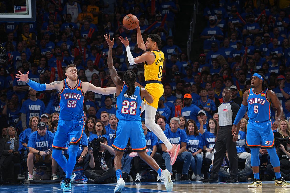 Birinci maçın ilk yarısında sadece altı sayı attıktan sonra Haliburton, Pazar günkü Oklahoma City’deki 123-107 mağlubiyetinin ilk iki çeyreğinde önemsiz bir üç sayı attı.