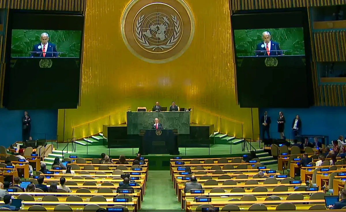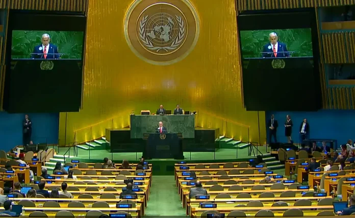 İsrail Başbakanı Binyamin Netanyahu, Cuma günü Birleşmiş Milletler’de heyetlerin kitlesel bir yürüyüşünün yanı sıra izleyicilere davet edilen taraftarların tezahüratları için sahneye çıktı.Netanyahu’nun konuşması öncesinde çok sayıda delege Genel Kuruldan çıktı.
