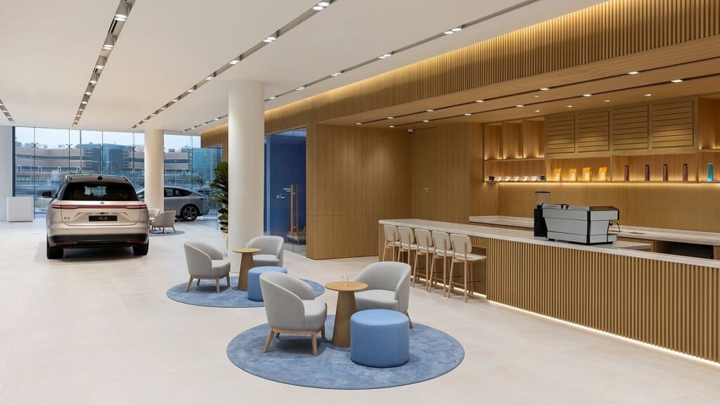 Nıo’nun global şirket içi alan tasarım ekibi tarafından tasarlanan NIO Hub, rafine, teknoloji odaklı bir ortam sunuyor. 772 metrekarelik tesiste 433 metrekarelik bir showroom ve 339 metrekarelik bir teslimat merkezi, beş araca kadar görüntüleme alanı ve sorunsuz, kişiselleştirilmiş kullanıcı teslimatları için üç teslim bölmesi bulunuyor. Tesiste ayrıca danışma odaları, satış sonrası resepsiyon ve nıo’nun şarj ve pil değiştirme çözümlerindeki yeniliklerini vurgulayan bir NIO Güç deneyimi bölgesi bulunmaktadır.