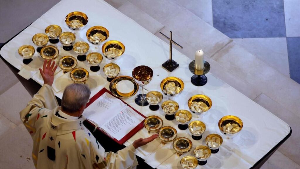 Paris Başpiskoposu Laurent Ulrich, Pazar günü Paris’teki Notre-Dame de Paris Katedrali’ndeki bir ayin sırasında 2019’da yıkılan eskisinin yerini alan Fransız sanatçı ve tasarımcı Guillaume Bardet tarafından tasarlanan yeni ana sunağın kutsanması için dualara öncülük ediyor. Afp’ninBaşpiskopos dualara öncülük etti ve beş yıl önce yıkılan eskisinin yerini alan yeni bir sunağı kutsadı.