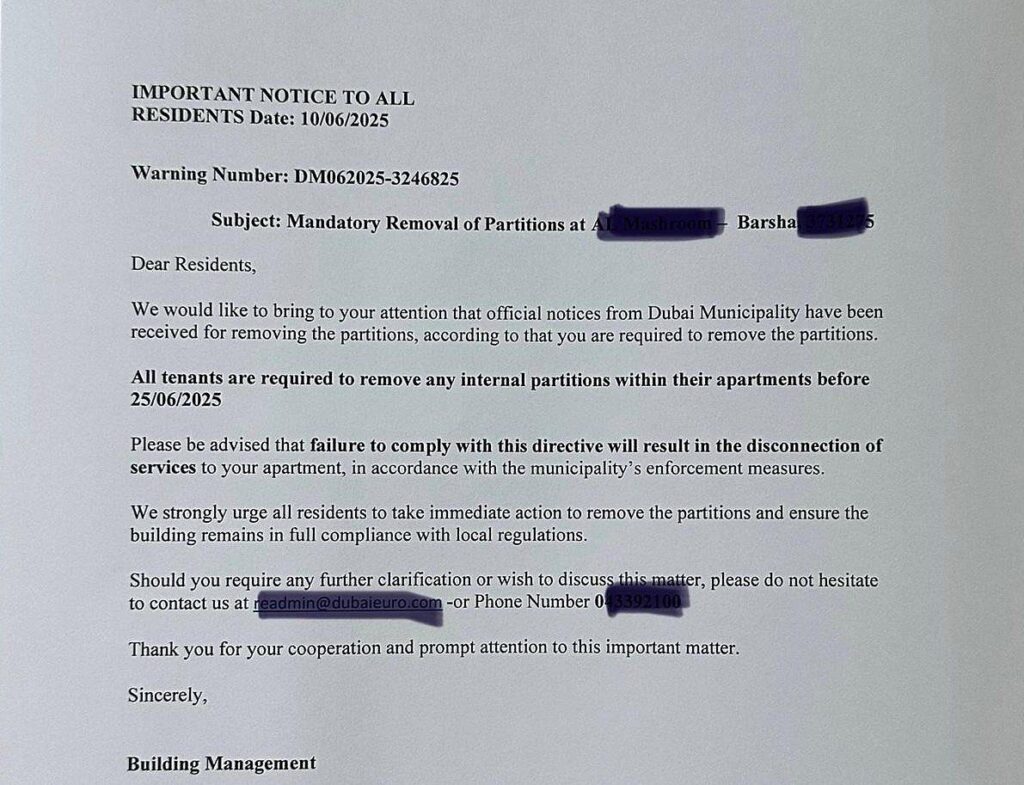 Dubai Belediyesi’ne göre, denetimlerden önce ev sahiplerine ve bina sahiplerine uyarılar yapılmıştı.Kampanya, konut birimlerinde yasadışı veya onaylanmamış yapısal değişikliklerin veya bölümlerin — geçici veya kalıcı olsun — yarattığı riskler ve bina normlarına uyumu sağlama ve uyumlu olmayan yapıları kaldırma ihtiyacı konusunda farkındalık yaratmak için bina sahipleriyle doğrudan iletişimi güçlendiriyor.