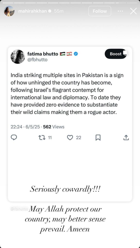 Oyuncu Mahira Khan, yazar Fatima Butto’nun İnstagram üzerinden attığı bir tweeti yeniden yayınladı ve buna “korkakça” adını verdi.