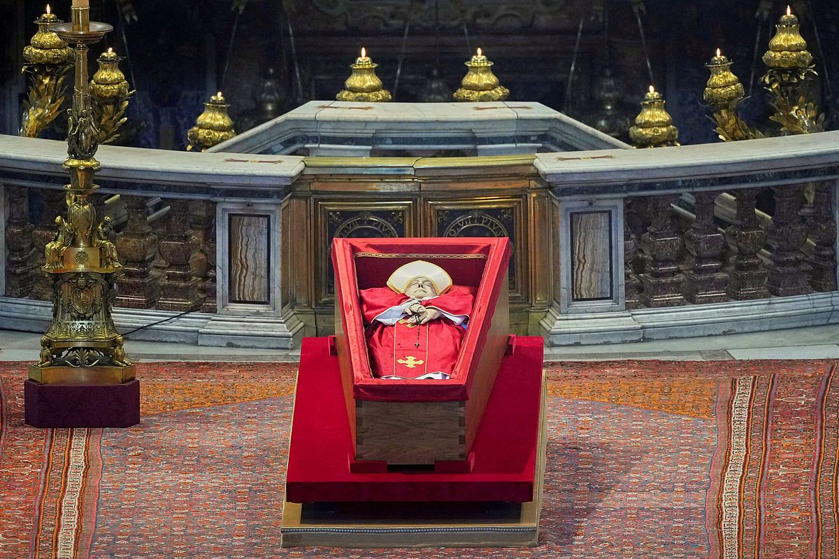 Açık bir tabutun içinde yatan cesedi, yaşadığı Vatikan ikametgahının şapelinden Aziz Petrus’a götürüldü ve kardinaller ve Latince ilahilerle büyük bir alayla merkezi kapıdan girdi.