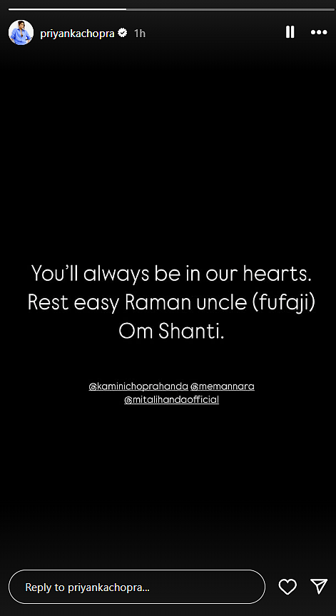 Küresel simge Priyanka Chopra Jonas, kuzeni aktris Mannara Chopra’nın babası amcası Raman Rai Handa’nın ölümünün ardından üzüntüsünü dile getirdi.