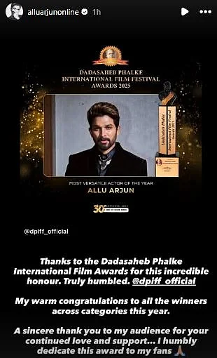 “Bu inanılmaz onur için Dadasaheb Phalke Uluslararası Film Ödülleri’ne teşekkürler. Gerçekten alçakgönüllü. Bu yıl kategorilerdeki tüm kazananları sıcak tebriklerim. Devam eden sevginiz ve desteğiniz için izleyicilerime içten bir teşekkür ederim…Allu İnstagram hikayesinde bu ödülü naçizane hayranlarıma ithaf ediyorum’ diye yazdı.