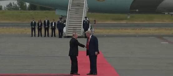 Trump uçağı Air Force One’dan indi ve Putin’i asfaltta bekliyordu. İkisi gülümserken selamlaştılar. ABD F-22 uçakları kırmızı halının her iki tarafına yerleştirildi.