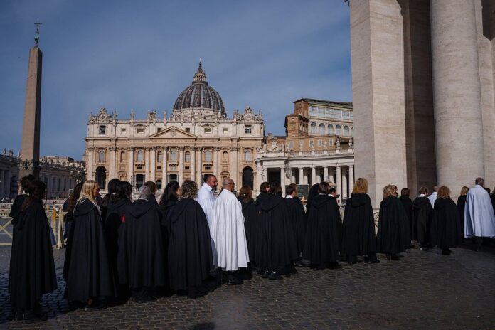 Roma’da hacıları incelemek, çalışmak veya onlara eşlik etmek için siyah, gri, beyaz, bej veya kahverengi alışkanlıklara sahip rahibeler, kardinalleri çevreleyen medya yutturmacasından uzak, her gün Aziz Petrus Meydanı’na gelir ve giderler.