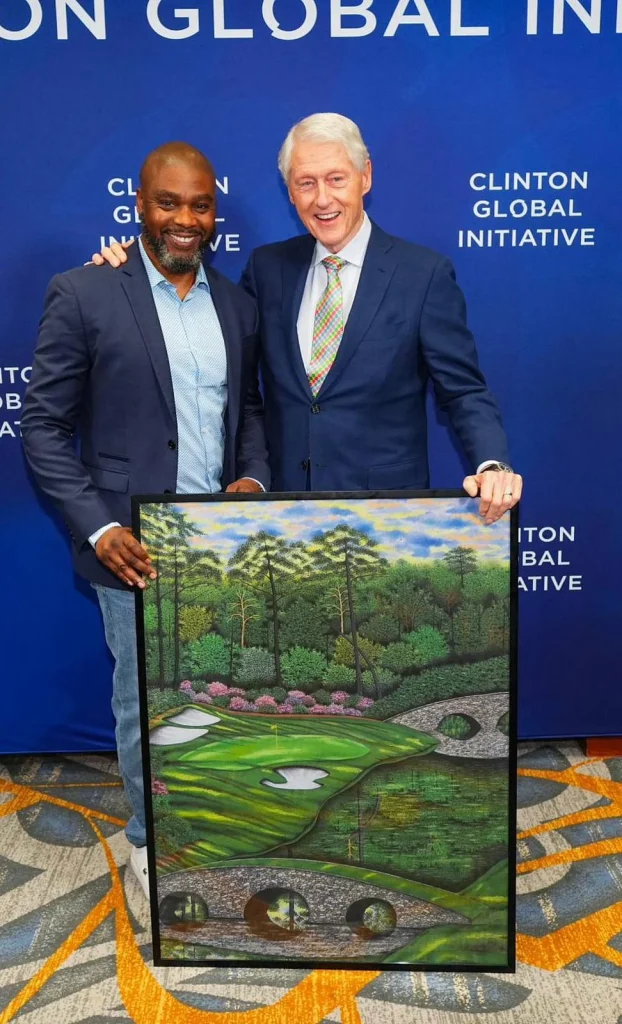 Kısa süre önce golf çizimlerinden birini eski ABD Başkanı Bill Clinton’a sunan bir fotoğrafını paylaştı. Sanat eseri tanınmış bir avukat tarafından satın alınmıştı.